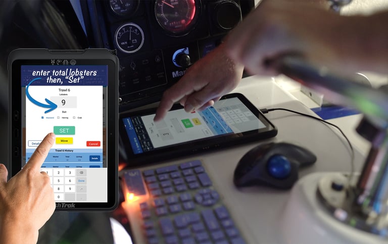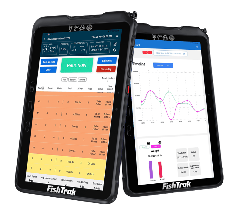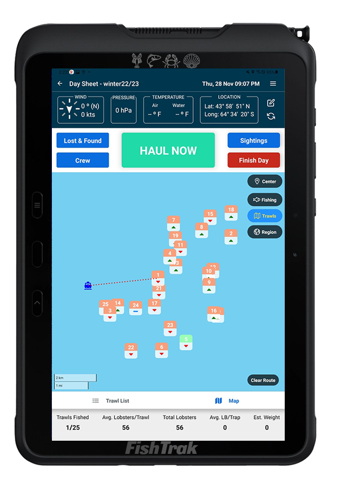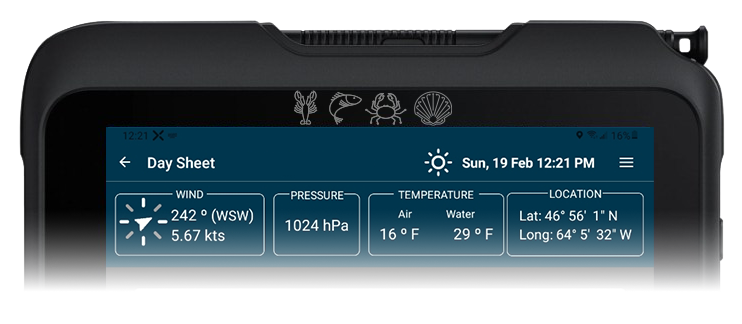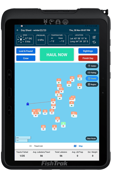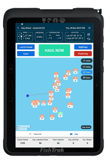 Capture catch totals, trap performance, location, depth, bait, weather, and bottom conditions in seconds — right from the wheelhouse.