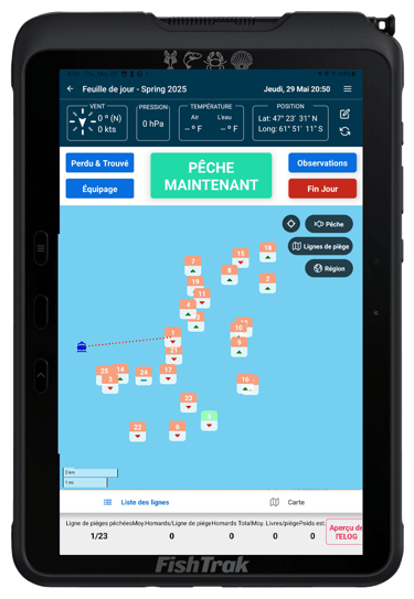 FishTrak vous apporte la clarté, la confiance pis le contrôle que le papier, la mémoire pis l’instinct ne peuvent suffire. Chaque fonction est conçue pour de vraies conditions de pêche, de vraies équipes pis de vraies décisions — pour que vous tiriez plus de chaque levée pis de toute la saison.