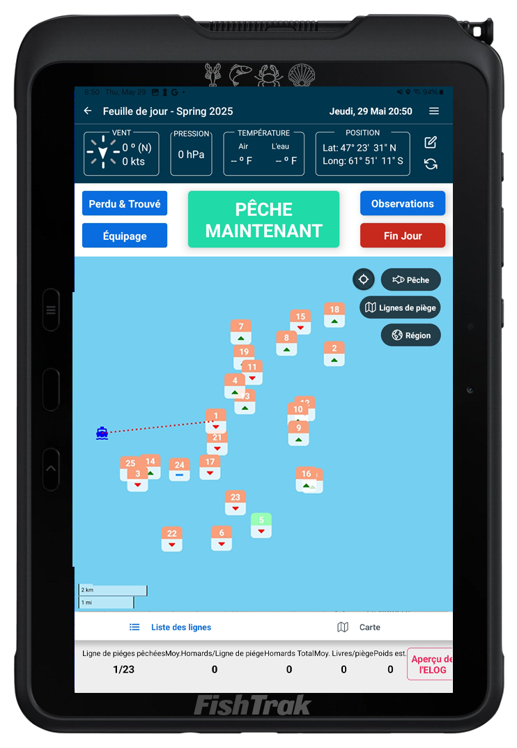 FishTrak vous apporte la clarté, la confiance pis le contrôle que le papier, la mémoire pis l’instinct ne peuvent suffire. Chaque fonction est conçue pour de vraies conditions de pêche, de vraies équipes pis de vraies décisions — pour que vous tiriez plus de chaque levée pis de toute la saison.