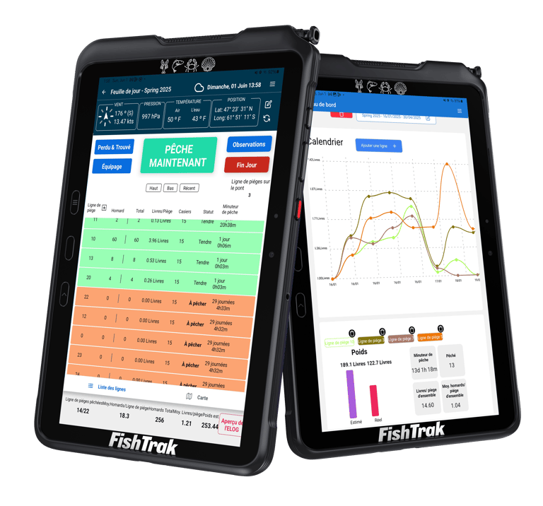 En quelques secondes depuis la tablette dans la timonerie, vous consignez les totaux de prise, la performance des casiers, l’endroit, la profondeur, l’appât, la météo, pis l’état du fond.